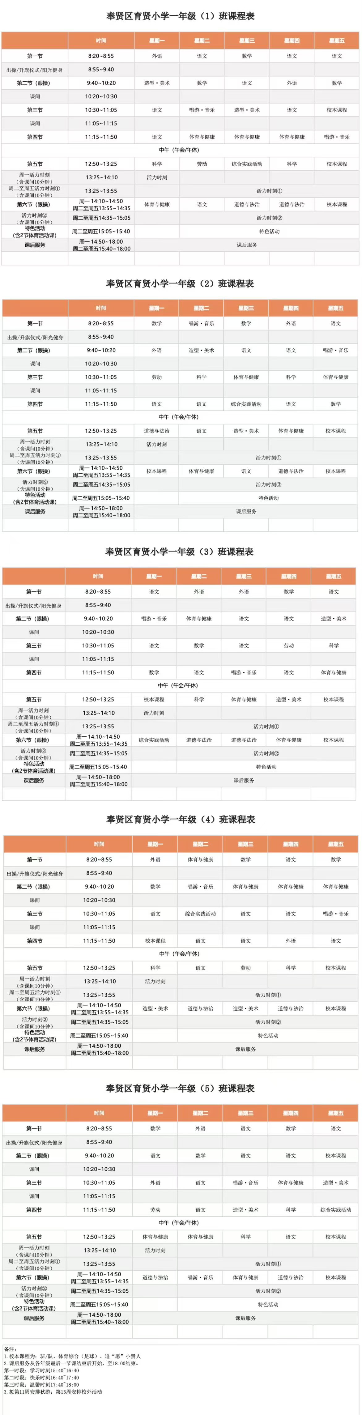 奉贤区育贤小学2025学年一年级各班周课表