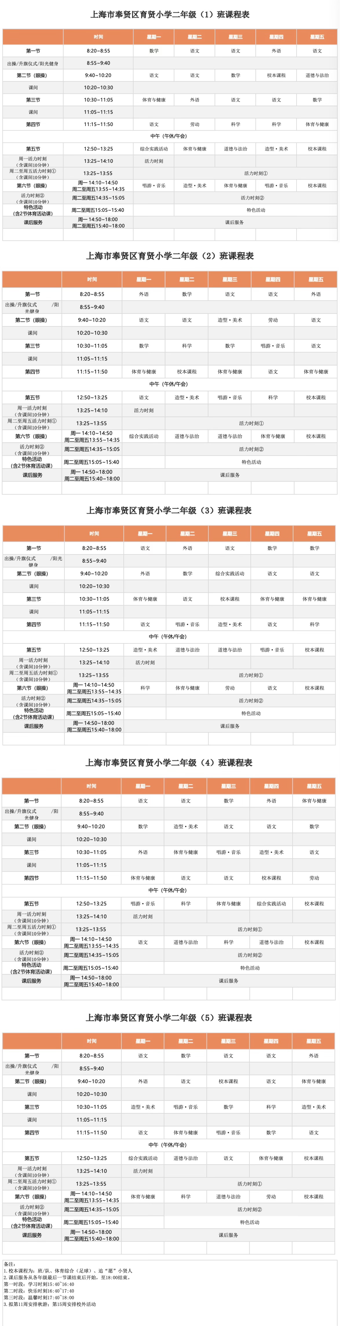 奉贤区育贤小学2025学年二年级各班周课表