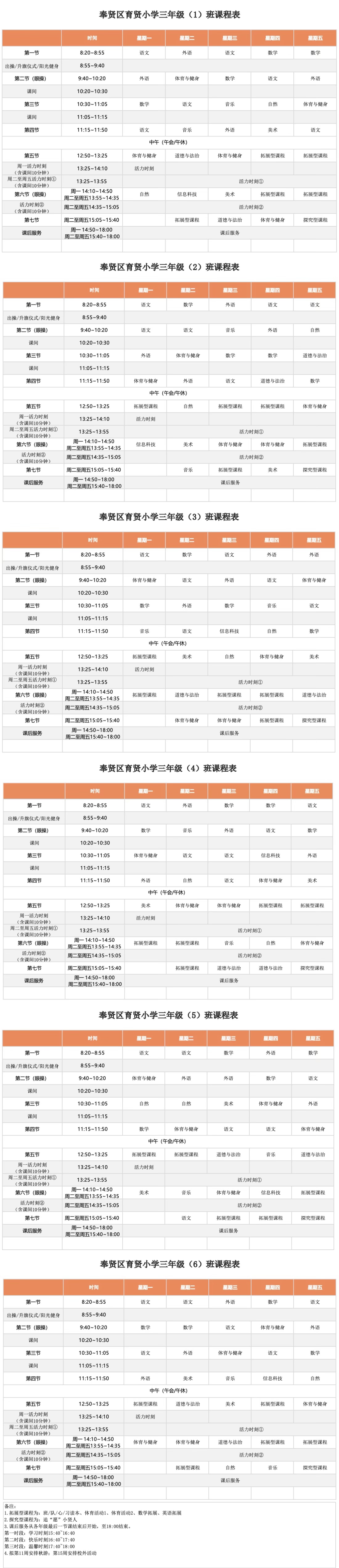 奉贤区育贤小学2025学年三年级各班周课表