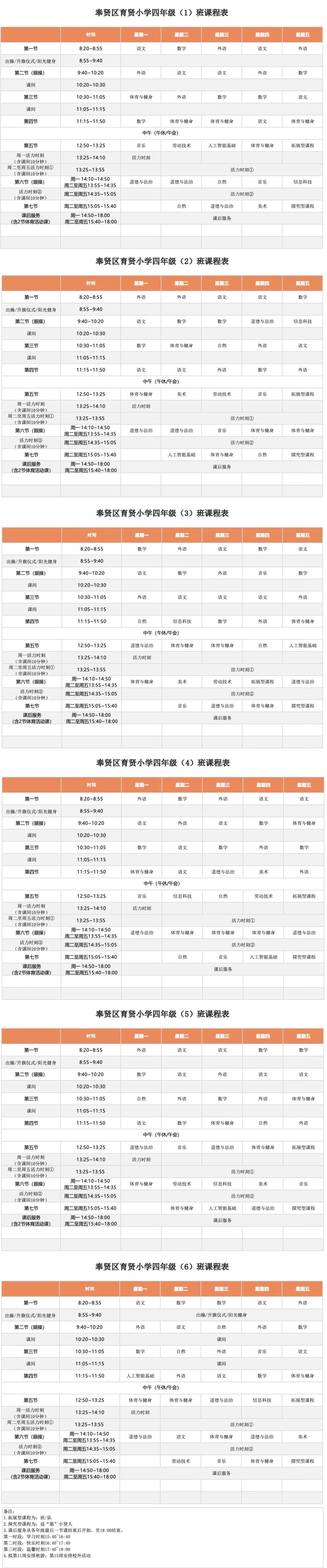 奉贤区育贤小学2025学年四年级各班周课表