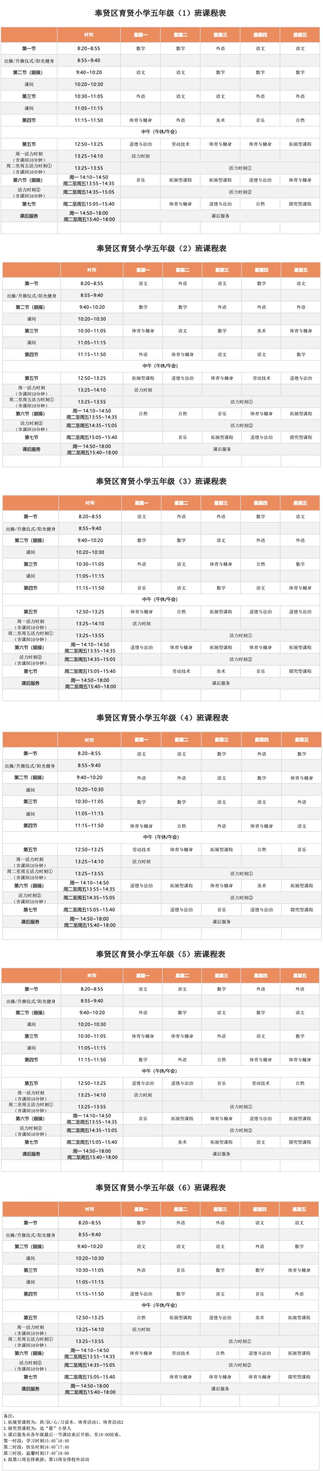 奉贤区育贤小学2025学年五年级各班周课表